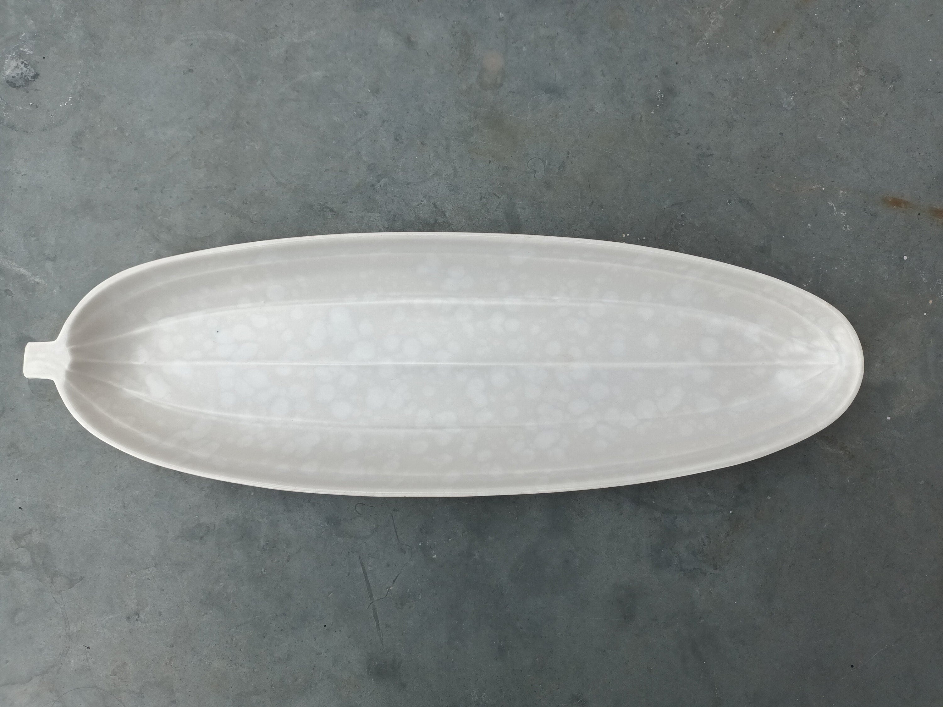 Part of the Poole pottery TwinTone range, this elongated dish, designed like a marrow (and perhaps for serving a marrow smothered in butter?) would have been produced between 1953-68 as the marking C97 for the Peach Bloom/Seagull colour way is dated for that period. Looking more like a pastel pink the underside colour works perfectly with the light grey mottled, almost splattered top side and gives this a very modern look.