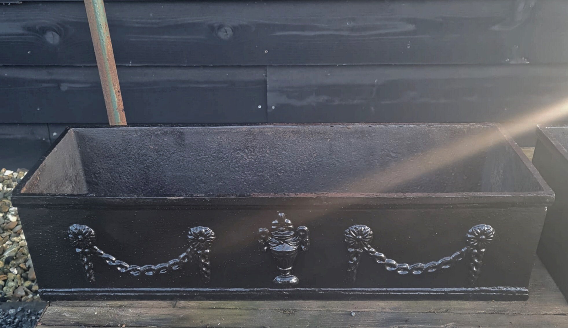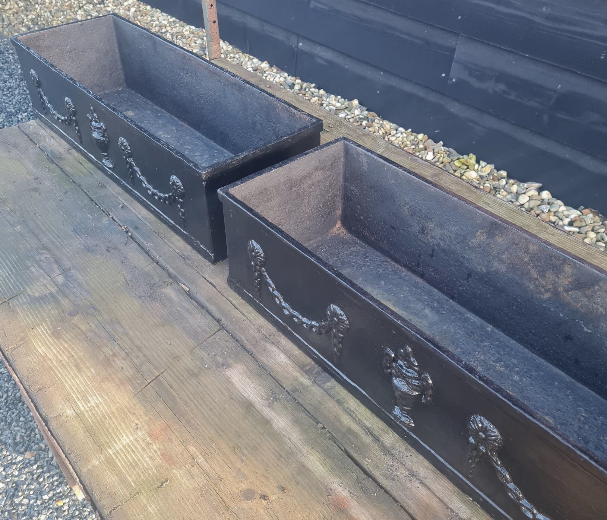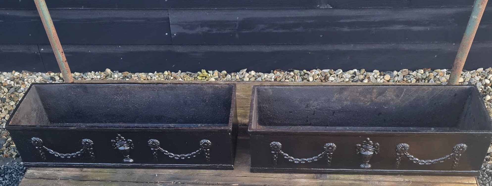 Pair of lovely vintage, possibly antique ornate cast iron trough planters with floral swag and urn design. They have a worn black paint finish, which adds that vintage look, or you could repaint if you wanted. These would be great either side of a front door or as window boxes. Measurements are 20cm w x 60cm L (message if you need the height). (note the price is for the pair)