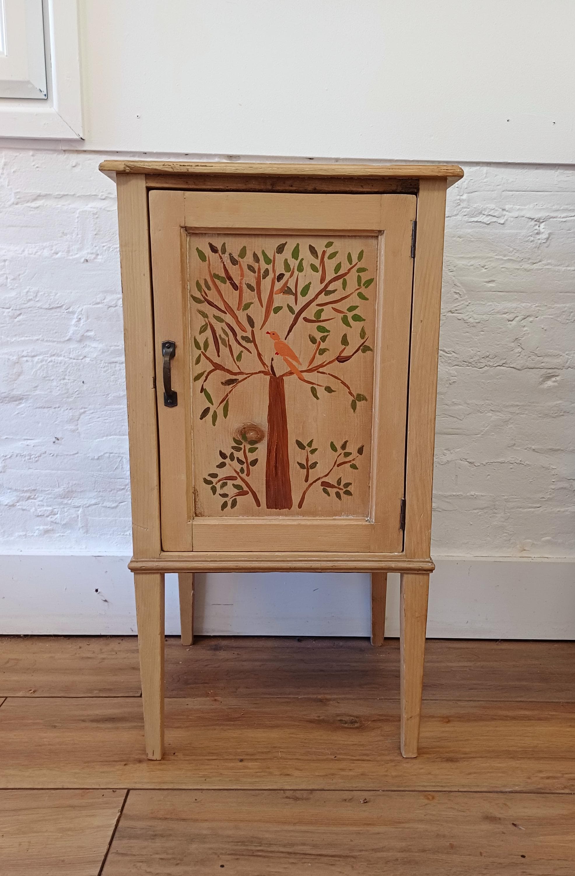 This is an ever so cute pine bedside table - originally a 'pot cupboard'! - with a handpainted decorative pattern of a golden/orange bird in a tree. The wood has a nice rustic finish but it has obviously been waxed at some point, and the style of the painting gives it that up to date folk art look. The handle is attached to a push latch, in working order and the inside of the cupboard is in good order.
